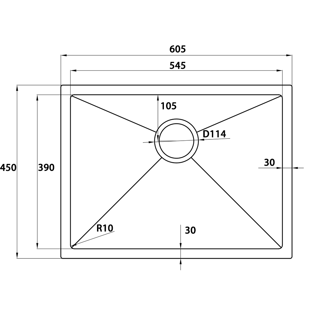 - Single sink measures 605 x 450 x 250mm (L x W x D)